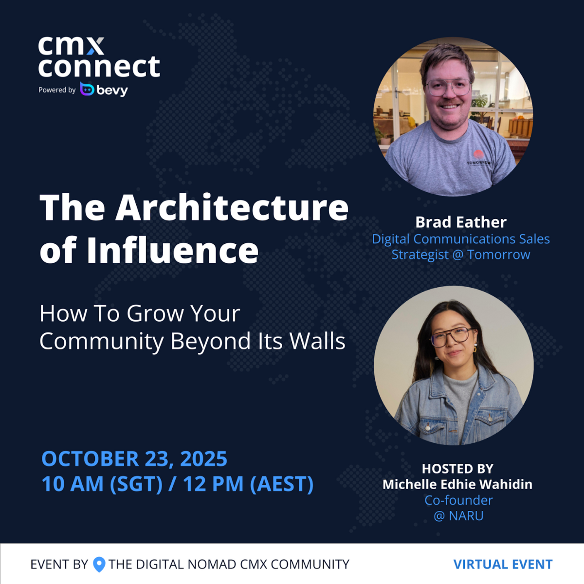 In my upcoming session, The Architecture of Influence: How To Grow Your Community Beyond Its Walls - courtesy of The Digital Nomad CMX community - I’ll unpack how to expand your reach by thinking beyond your current members and joining the conversations that shape your industry.